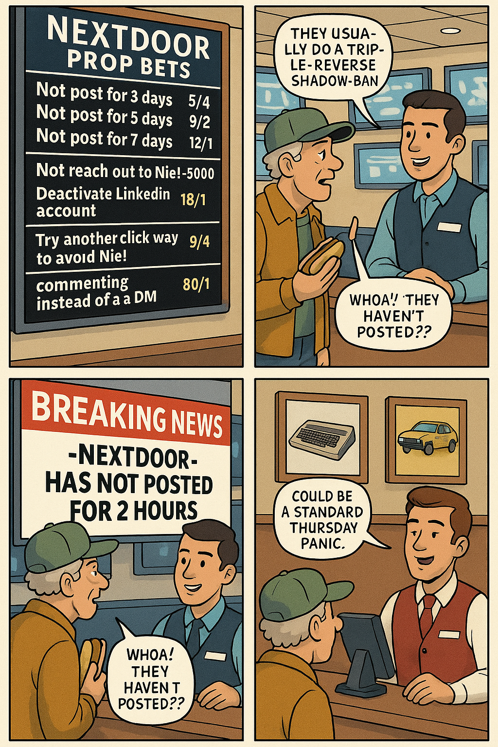 New prop added — ‘Will Nextdoor accidentally enable comments again today?’ Odds currently 500/1. Place bets responsibly.”