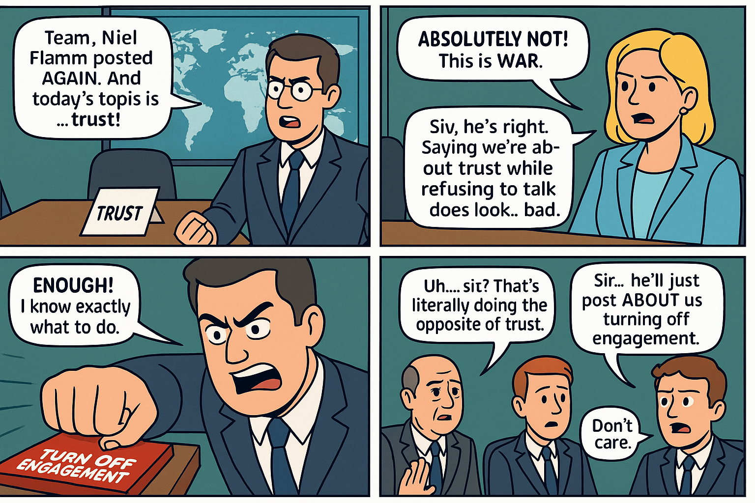 “Team, Niel Flamm posted AGAIN. And today’s topic is… trust. TRUST! The one thing we avoid by not engaging with him!”