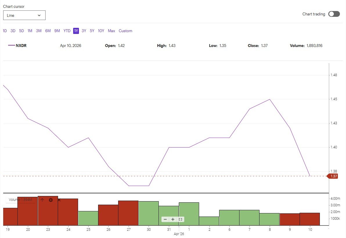 Now layer in the market reality. $NXDR closed at $1.37 today, brushing right against its recent low of $1.36 (March 27 & 30, 2026). I’m down about $0.60 per share. I’m not moving the stock alone—but the pattern speaks for itself.